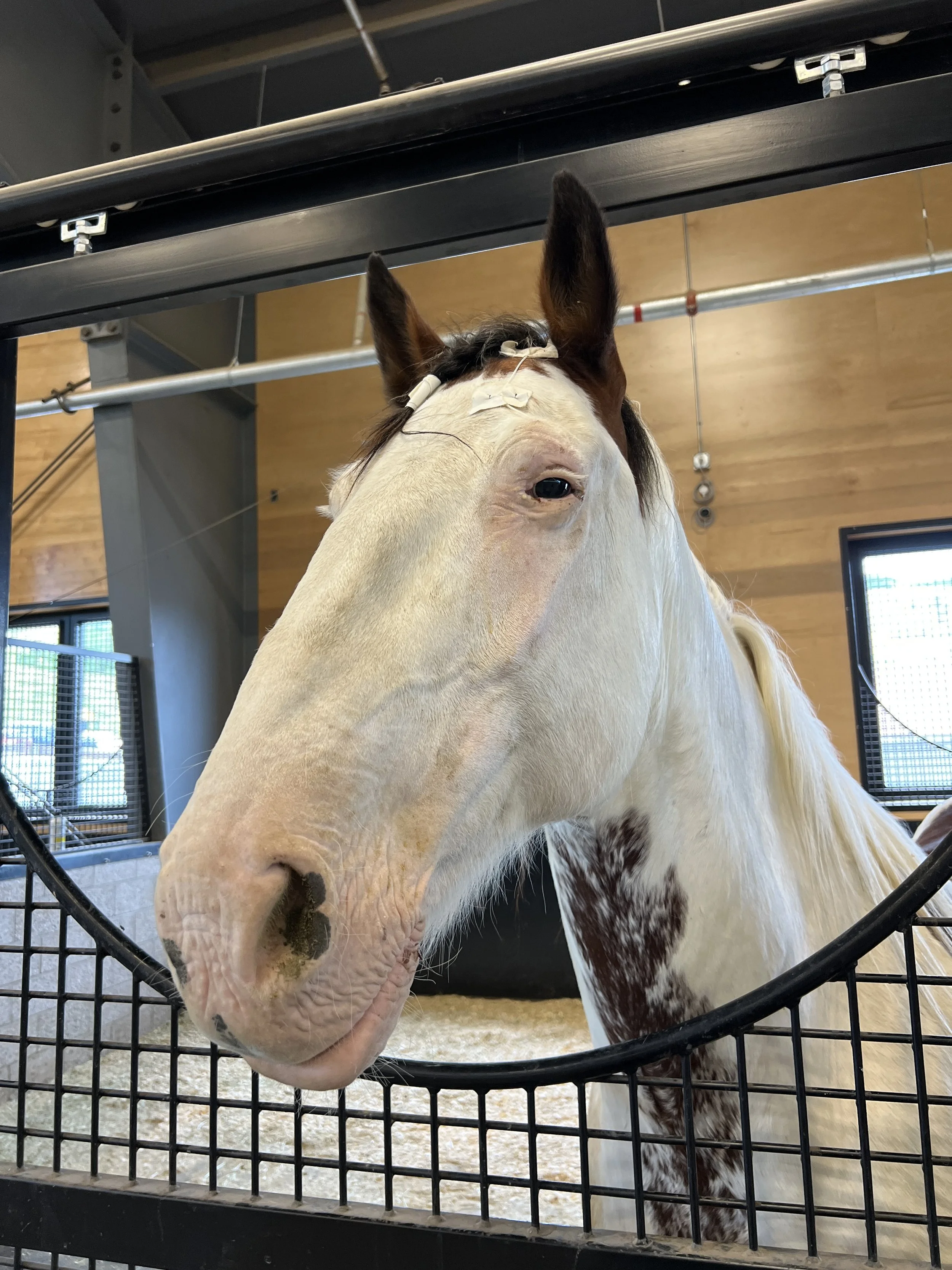 Skittles was adopted during the summer of 2025. Unfortunately, his light colored skin left him vulnerable to many skin conditions. When he developed squamous cell carcinoma in his eye, his owner no longer had any use for him. Saving Gracie, along with our amazing veterinary ophthalmologist, knew that with surgery and proper long-term care, Skittles could keep his eye, his vision, and remain sound and even rideable! Skittles has settled into his home at Saving Gracie well and still gets to go out on the trail, with sun protection, of course!
